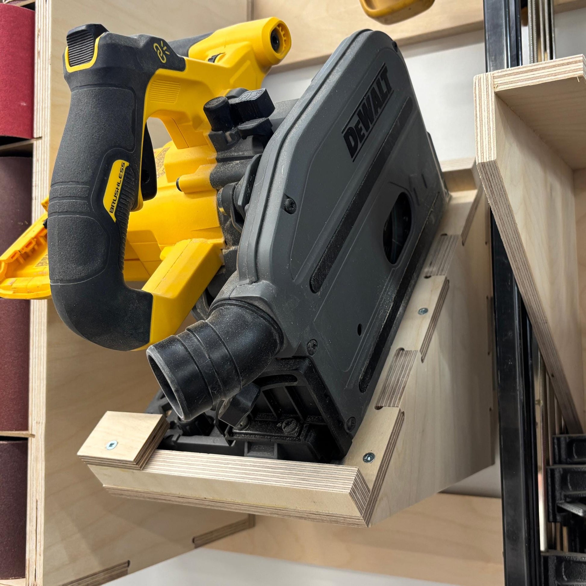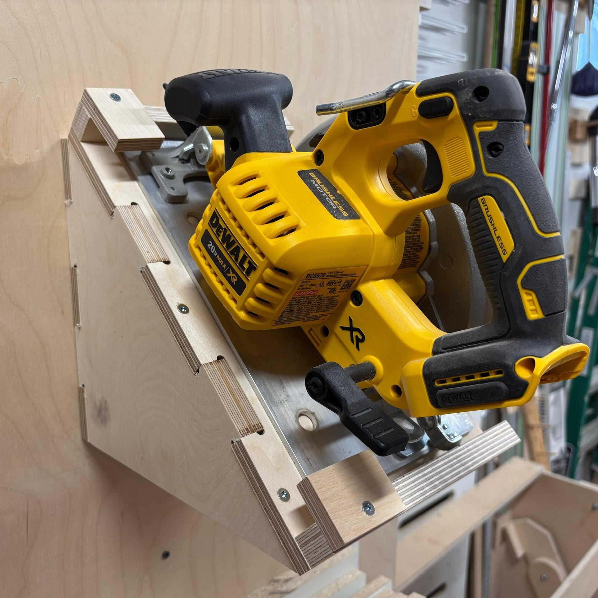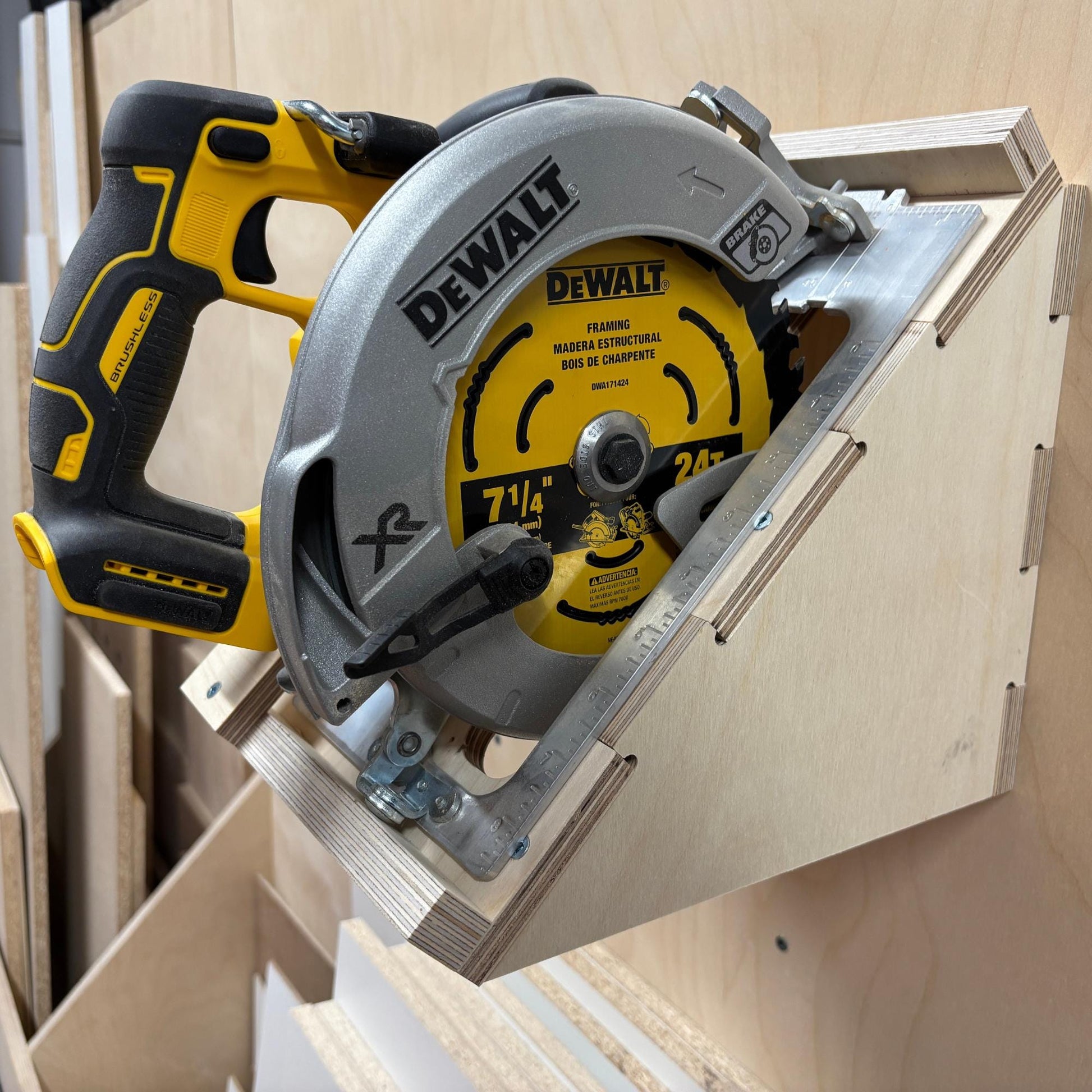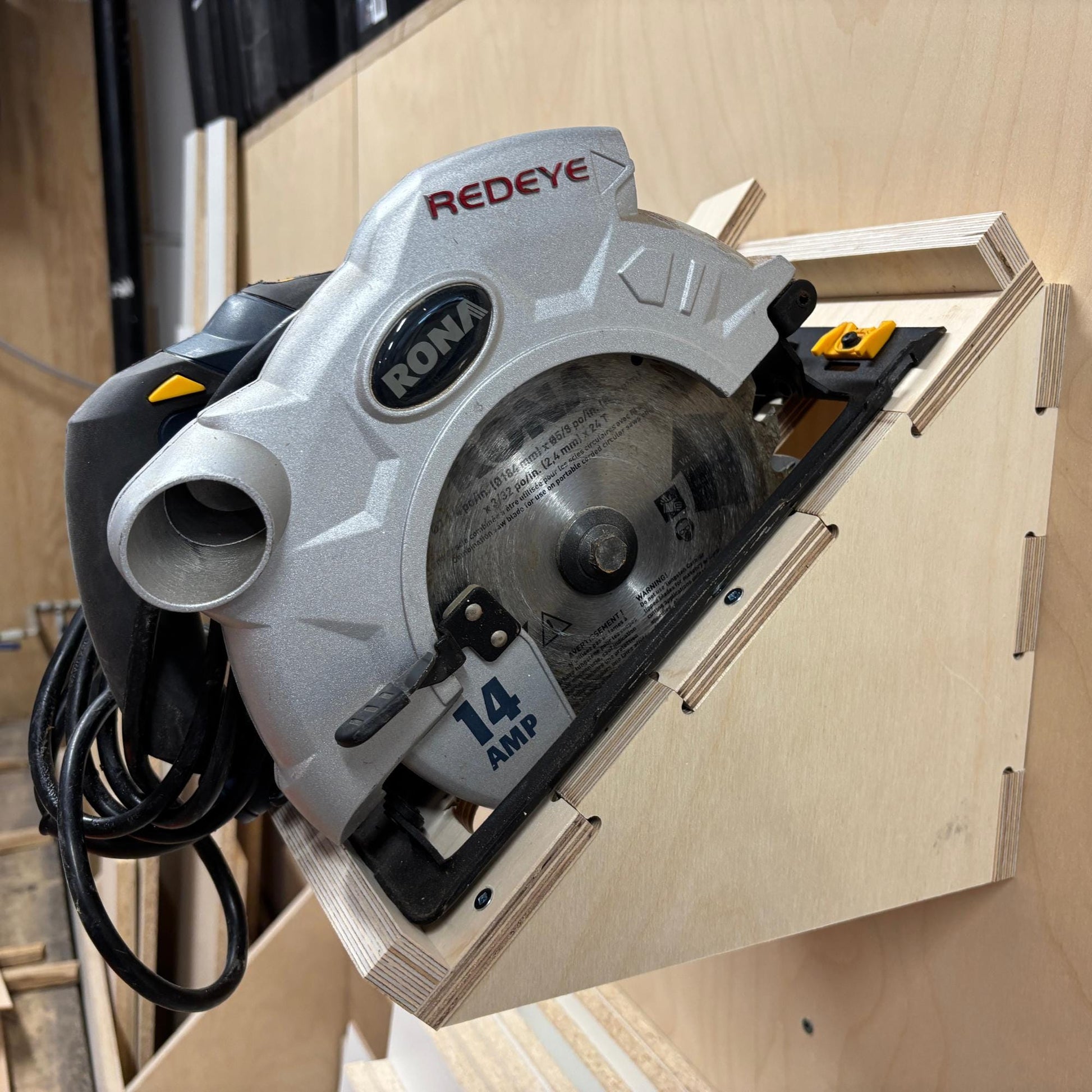 Organisez votre atelier et protégez votre scie circulaire avec ce support mural robuste, entièrement fabriqué en contreplaqué de merisier 100% bois.